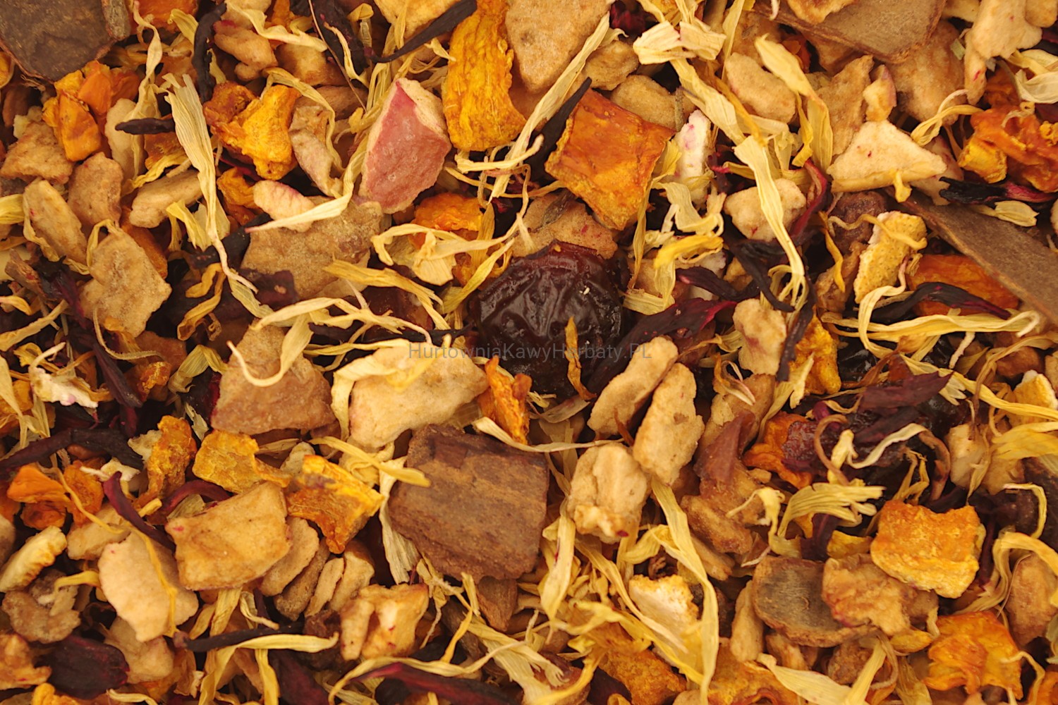 Składniki: płatki suszonego jabłka, suszone kawałki dyni, suszone płatki kwiatu hibiskusa, skórka pomarańczowa, kawałki cynamonu, żurawina suszona słodzona sokiem jabłkowym, aromat, płatki nagietka