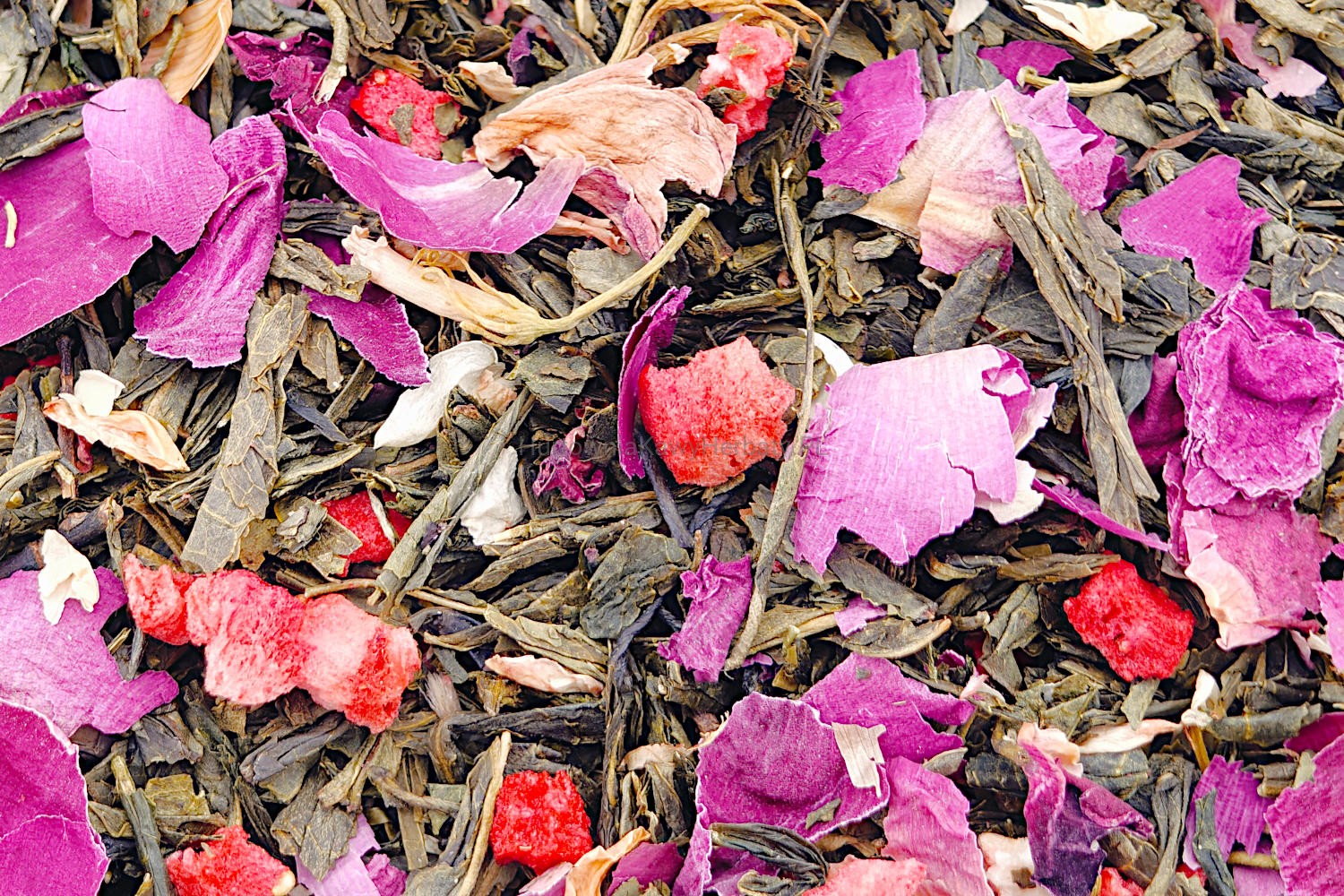 Składniki: herbata zielona sencha, truskawka liofilizowana, płatki jaśminu, płatki piwonii, płatki róży, aromat