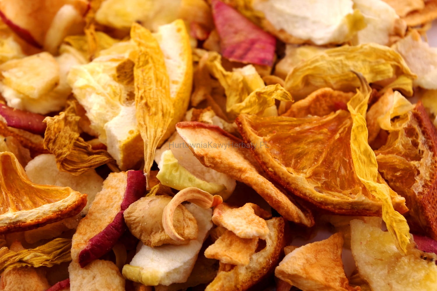 Składniki: banan suszony (banany susz., cukier, olej kokosowy, aromat) jabłko suszone (jabłko, E223), skórka pomarańczy (16%), pomarańcza suszona (13%), pomarańcza liofilizowana (3%), naturalny aromat, płatki kwiatu pomarańczy, kwiat słonecznika.