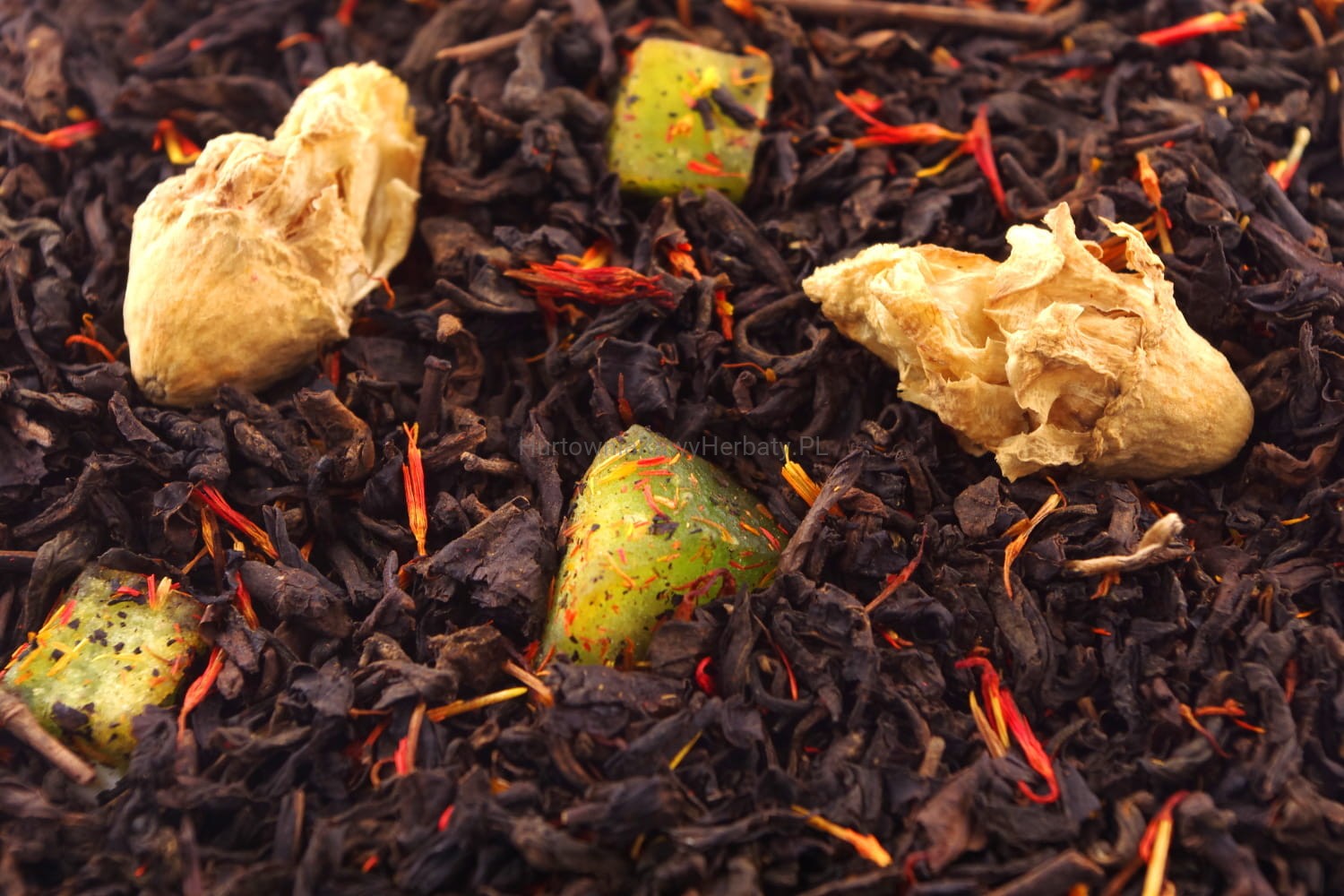 Składniki: herbata czerwona Pu Erh, aromat, pomelo kandyzowane (cukier, pomelo, substancja konserwująca E220, barwniki (E133+E102)), kwiat opuncji, płatki krokosza.